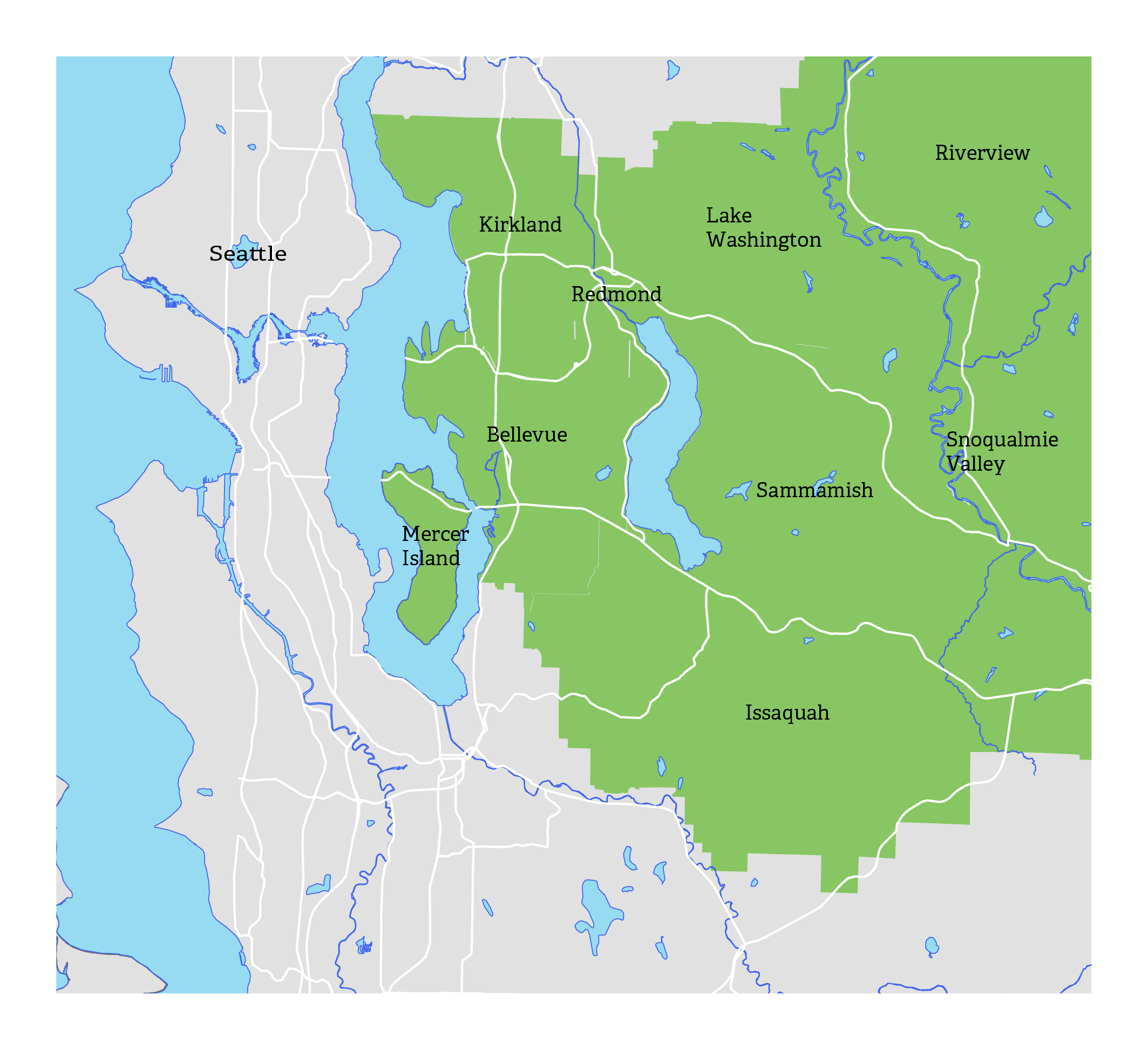The East Region of King County includes, Bellevue, Issaquah, Kirkland, Mercer Island, Newcastle, North Bend, Redmond, Sammamish, Skykomish, and Snoqualmie.