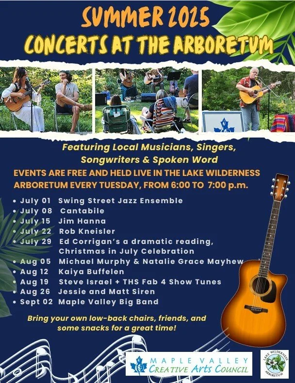 Each Tuesday evening at 6 p.m., the Perennial Garden comes alive with music. Presented by the Maple Valley Creative Arts Council in partnership with the Arboretum Foundation, the Summer Concert Series features local musicians, singer‑songwriters and spoken‑word artists performing free of charge. Visitors are encouraged to bring a chair or blanket and enjoy grass‑root performances in a naturally beautiful setting .