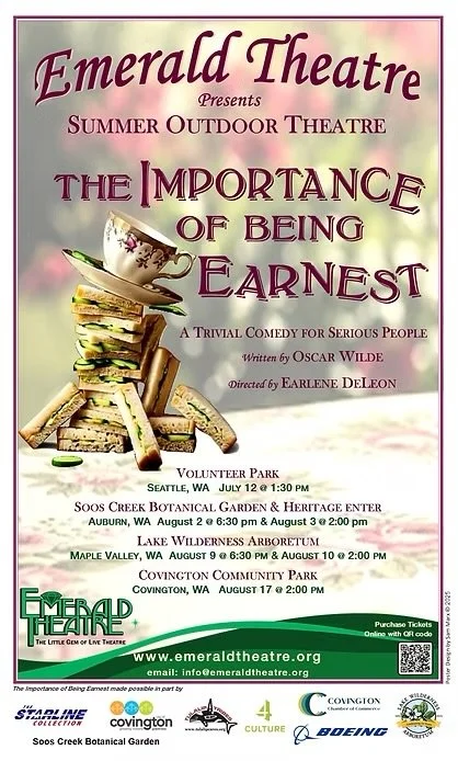 Emerald Theatre presents Oscar Wilde’s classic satire The Importance of Being Ernest on the Arboretum grounds. Performances take place August 9 at 6:30 p.m. and August 10 at 2 p.m. Tickets are “pay‑as‑you‑can,” offering accessible theatre in a garden setting .